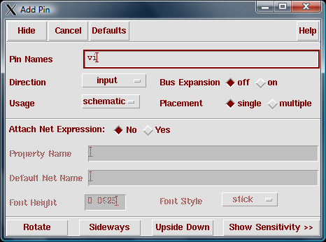 (11) Use "Add --> Pin" to add the input pin (Pin Name: vi) and the output pin (Pin Name: vo) of the inverter.